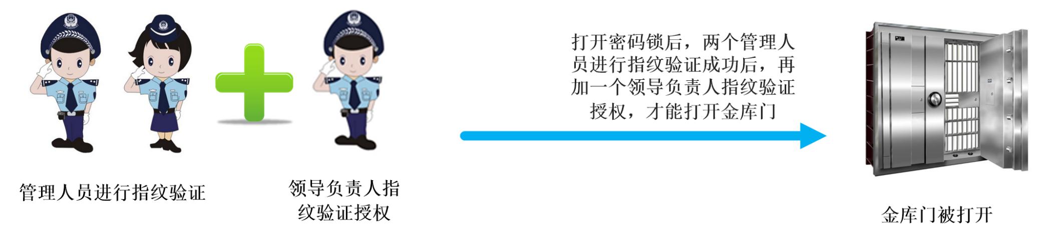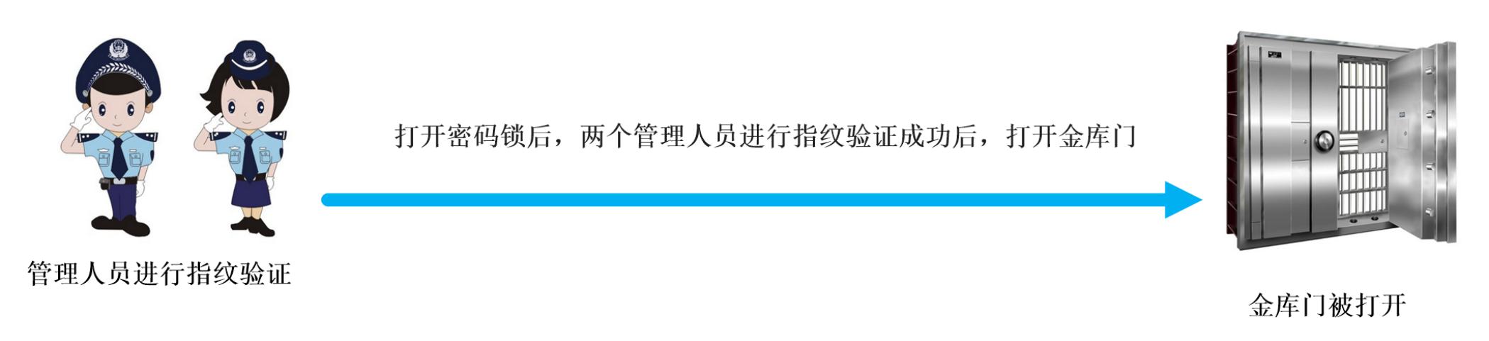 工作时间段进入金库,首先由两名要入库的管理人员通过钥匙或密码锁打开机械锁后(1把或2把机械锁),在指纹机上进入指纹验证,前端机验证指纹组合有效后打开电子锁,入库人员可以开门进入金库;在规定的时间段内完成作业,关好金库门,不然系统将会产生金库门开启超时报警。管理中心管理软件上收到开门信息并进行存储。