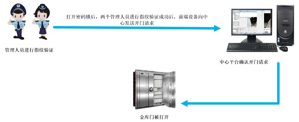 工作时间段进入金库,首先由两名要入库的管理人员通过钥匙或密码锁打开机械锁后(1把或2把机械锁),在指纹机上进入指纹验证,前端机验证指纹组合有效后向管理中心发送开门请求,管理中心操作人员接到提示信息后可在管理软件上看到现场抓拍的图像和之前存档的人员信息,核对无误并确认现场无异常情况后,确认开门,金库电子锁打开,入库人员可以开门进入金库;在规定的时间段内完成作业,关好金库门,不然系统将会产生金库门开启超时报警。